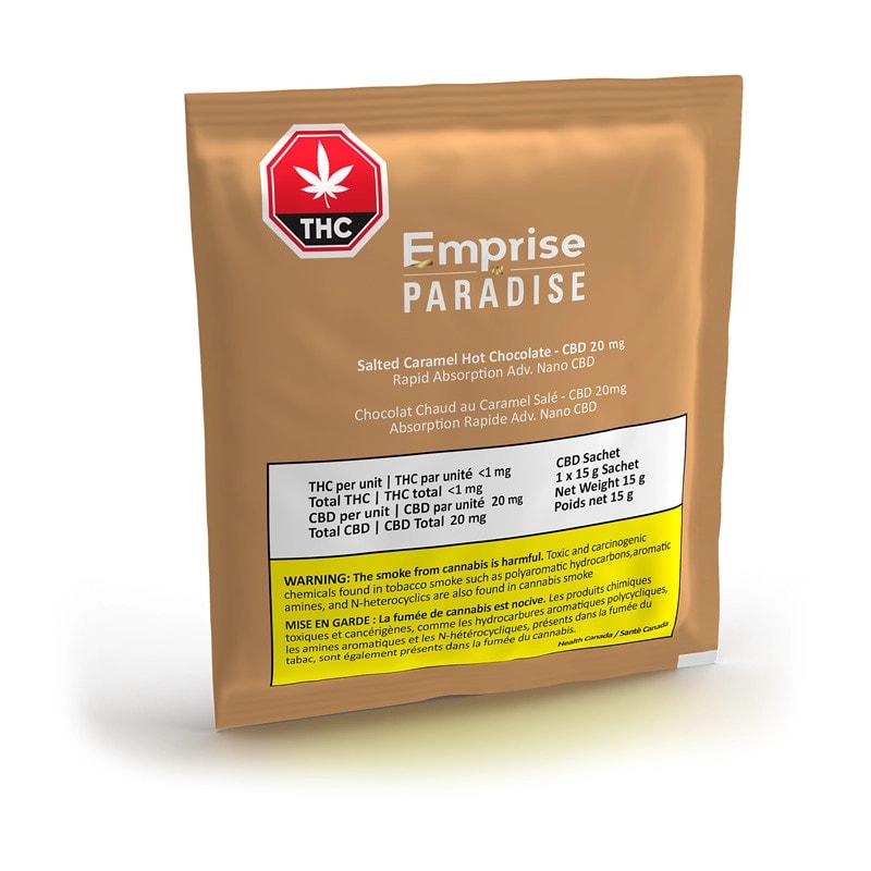 EMPRISE IN PARADISE ORGANIC VEGAN SALTED CARAMEL HOT CHOCOLATE IS AN ALL-IN-ONE SOLUTION FOR YOUR DAILY DISCRETE CUP OF GOLD DELIVERING RAPID-ABSORPTION 20MG CBD-DOMINANT PRODUCT.