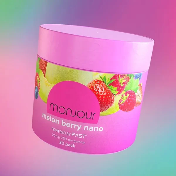 Monjour Melon Berry Nano CBD gummies offer a jolt of CBD powered by FAST™, our fast acting soluble technology. Each gummy contains 20 mg of CBD, with peak CBD levels nearly 2 times higher and delivered 50% faster. Experience the sweet, berry-flavour in every bite. Peak CBD levels that are 80% higher and are delivered 50% faster than identical gummy without nano-emulsion according to a clinical study. Individual results may vary.
