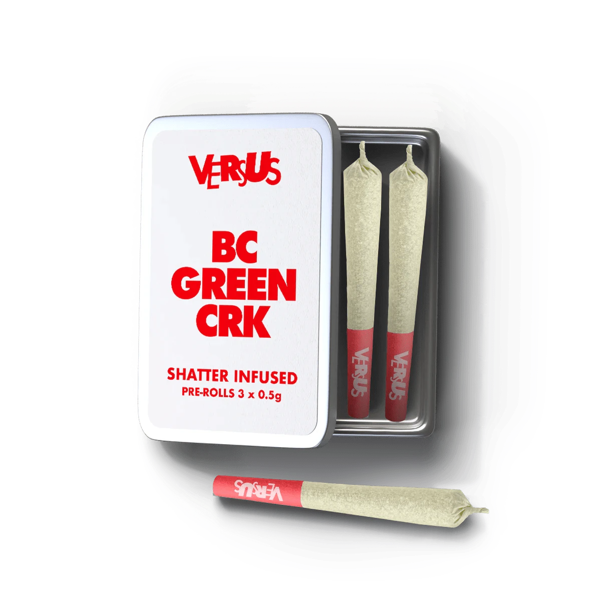 Double down on our favourite strain with Versus BC Green CRK Shatter Infused Pre-Rolls. Our BC Green CRK flower is infused with BC Green CRK strain-specific shatter, offering an amped-up experience of our signature strain. All-new Versus Shatter Infused Pre-Rolls deliver very high potency and promise a smooth, consistent burn — every time.