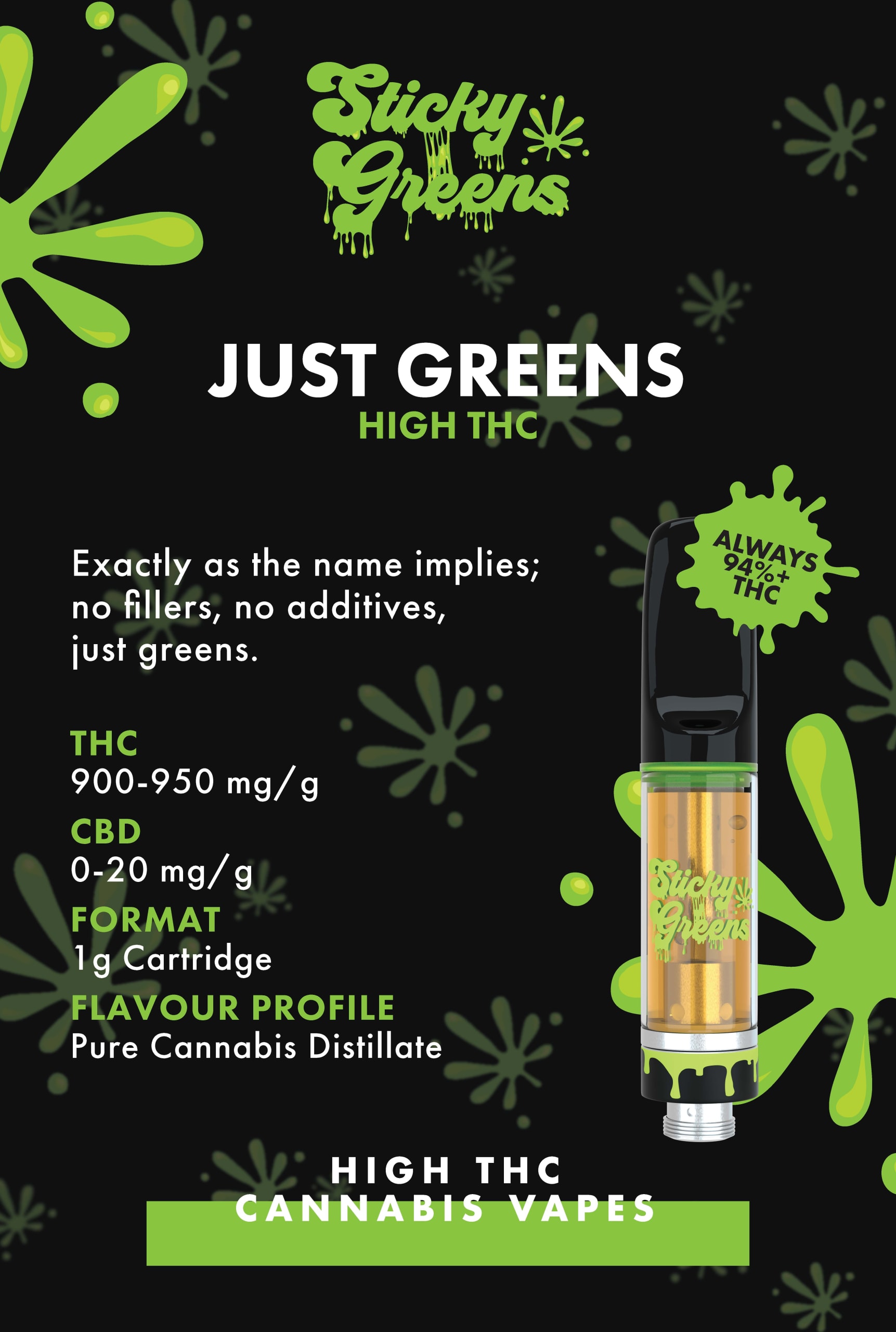 Just Greens is as simple as it gets. High THC and no terpenes added to maximize the potency and packs pure THC. Compatible with 510-thead battery. Sticky Greens is a Saskatchewan-based brand comprised of a team that has been involved in the cannabis space since legalization.